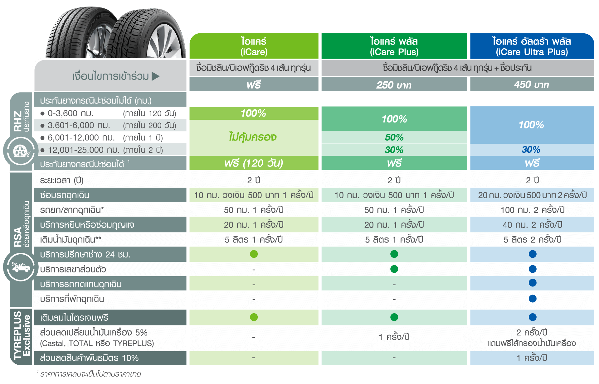 - ไอแคร์ อัลตร้า พลัส (iCare Ultra Plus) : เมื่อเปลี่ยนยางมิชลิน หรือ บีเอฟกู๊ดริช รุ่นใดก็ได้ 4 เส้น และซื้อแพคเกจประกันยางเพิ่ม มูลค่า 450 บาท ณ วันที่เปลี่ยนยางใหม่ พร้อมแอดไลน์ @tyreplus และลงทะเบียน